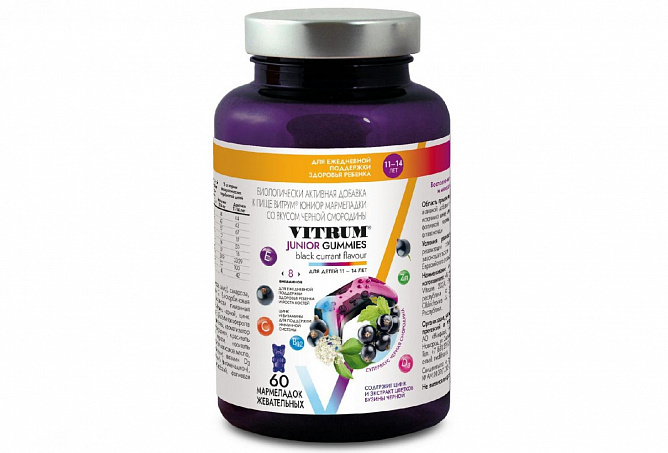 Витрум Юниор, мармеладки со вкусом черной смородины - витаминно-минеральный комплекс для детей 11-14 лет, содержит 8 витаминов, цинк и экстракт цветков бузины черной для ежедневной поддержки иммунитета ребенка.