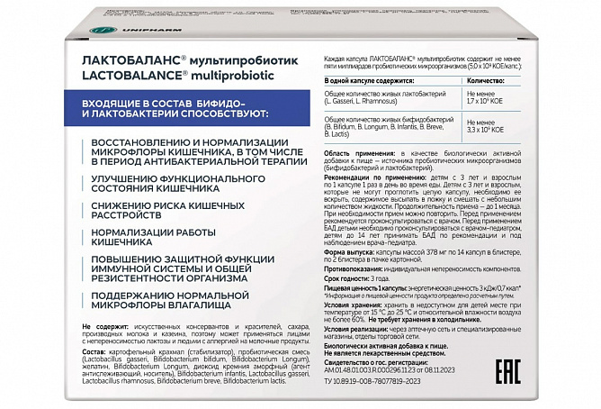 Пробиотические микроорганизмы, входящие в состав ЛАКТОБАЛАНС®, сохраняют стабильность при комнатной температуре в течение всего срока годности, не требуют хранения в холодильнике.