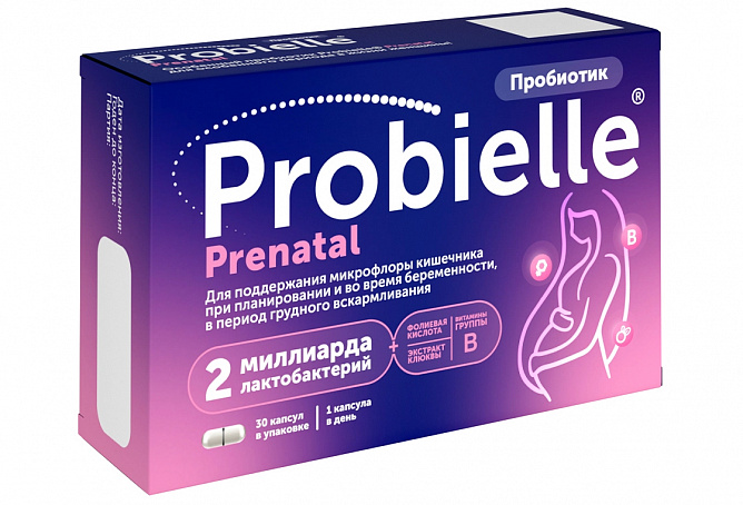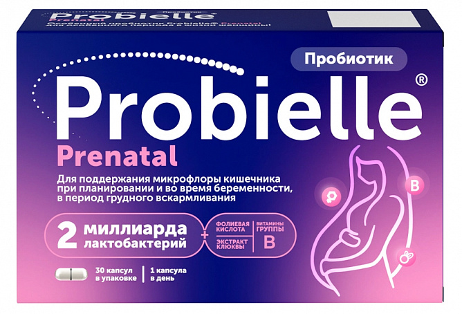 Биологически активная добавка к пище Пробиэль Пренатал - специально разработанная комбинация 2 миллиардов полезных лактобактерий, витаминов В1 и В2, фолиевой кислоты и экстракта плодов клюквы для поддержания естественного баланса микрофлоры кишечника при планировании и во время беременности, в период грудного вскармливания.