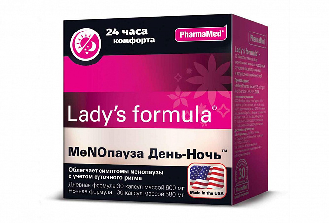 Lady's formula Менопауза День-Ночь это натуральный биологически активный комплекс, который состоит из дневной и ночной формул и позволяет контролировать самочувствие женщины 24 часа в сутки.