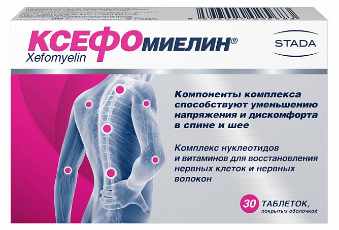 Биологически активная добавка к пище «Ксефомиелин» (далее Ксефомиелин) содержит важные компоненты (нуклеотиды и витамины), необходимые для восстановления нервных волокон и укрепления нервной системы. Благодаря оптимальному составу компоненты Ксефомиелина способствуют нормализации работы нервных волокон, уменьшению неприятных ощущений, напряжения и дискомфорта в мышцах спины, шеи, конечностей. Все это способствует повышению активности, подвижности и сохранению хорошего самочувствия.