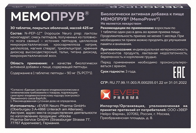 Мемопрув таблетки массой 425 мг- это биологически активная добавка к пище с доказанной клинической эффективностью при возникновении легких и умеренных проблем с памятью. Мемопрув рекомендуется взрослым при возникновении легких и умеренных проблем с памятью, для улучшения кратковременной памяти, для поддержания памяти при ее возрастных нарушениях, для улучшения процесса запоминания, для повышения концентрации внимания, ясности и живости ума, а также взрослым, находящимся в состоянии стресса, испытывающим проблемы со сном и перегрузки на работе. Перед применением рекомендуется проконсультироваться с врачом.