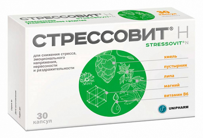 СТРЕССОВИТ® Н - комплекс магния, флавоноидов (экстракт хмеля, липы, пустырника), витамина В6, обладающий мягким успокоительным действием.