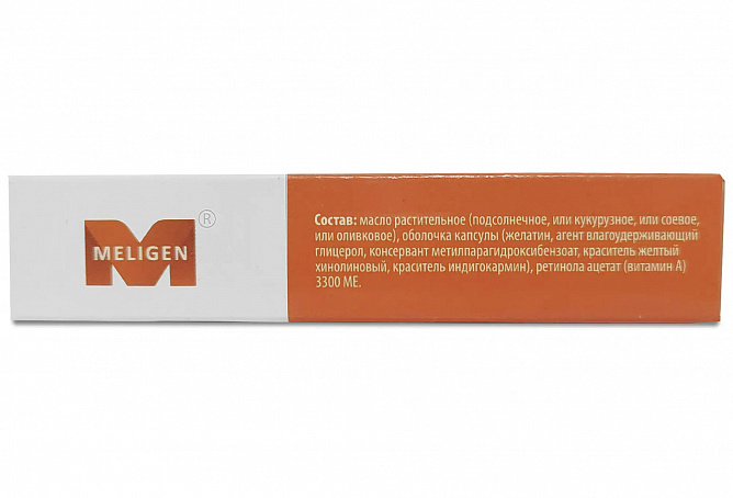 Масло растительное (подсолнечное или кукурузное, или соевое, или оливковое), оболочка капсулы (желатин, глицерол, консервант метилпарагидроксибензоат Е 218, краситель желтый хинолиновый Е 104, краситель индигокармин Е 132), ретинола ацетат (витамин А) 3300 МЕ.