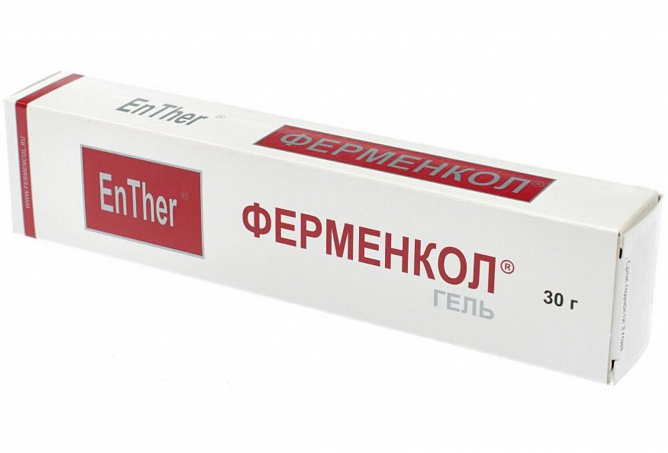 Ферменкол - гель косметический, который рекомендуется использовать для ухода за проблемной рубцово-измененной кожей лица и тела с целью улучшения ее внешнего вида. Входящий в крем комплекс коллагенолитических протеаз из гидробионтов обладает высокой коллагенолитической активностью, обеспечивая гидролиз пептидных связей коллагена. Проявляет избирательную активность к молекулам измененного коллагена и наименее активен в отношении фибрилл нативного коллагена, присущего здоровой коже. Коррекция и улучшение внешнего вида проблемной рубцово-измененной кожи происходит вследствие гидролиза избыточного коллагена. Гель способствует увеличению эластичности, смягчению, увлажнению проблемных рубцово-измененных участков кожи , восстановлению нормальной окраски проблемных рубцово-измененных участков кожи.