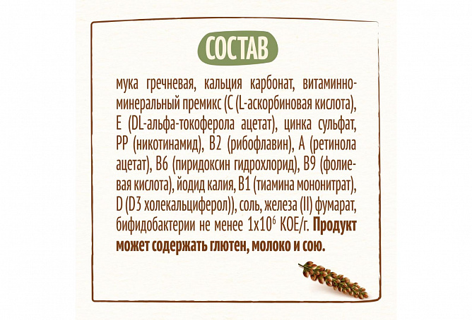 Каша обогащена пробиотиком BL, который способствует нормализации пищеварения, росту здоровой кишечной микрофлоры и укреплению иммунитета, что очень важно на начальном этапе введения прикорма.