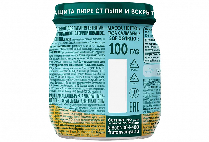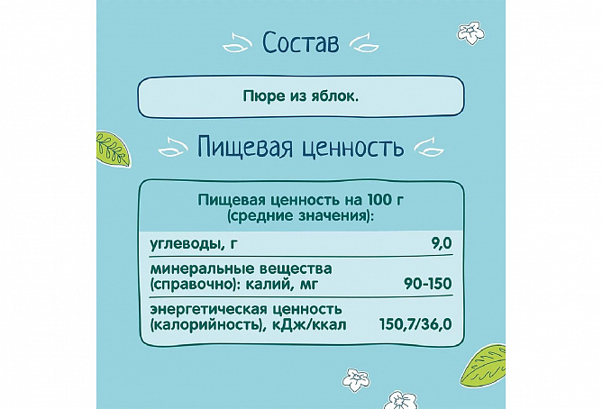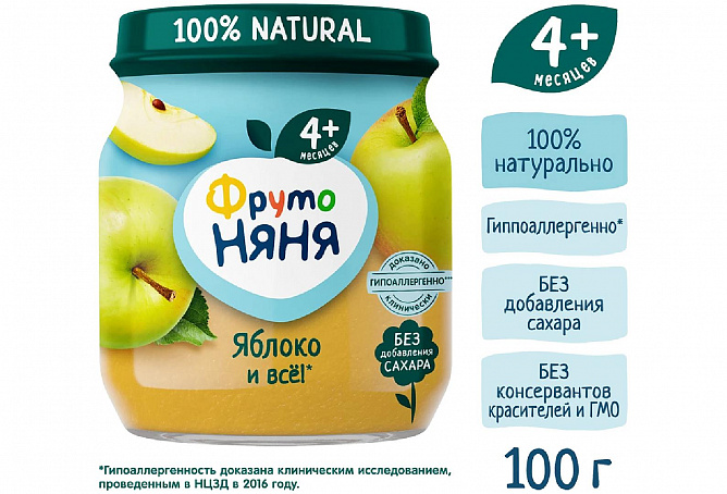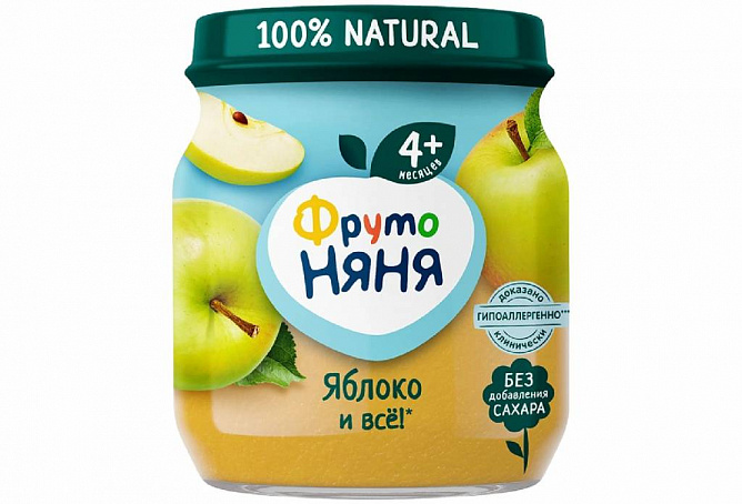 Пюре из яблок «ФрутоНяня» поможет разнообразить рацион ребенка на первом году жизни. Подходит для первого прикорма детей в возрасте с 4 месяцев. Пюре гипоаллергенно, и это доказано клинически. В его составе только натуральные компоненты — пюре из спелых наливных яблок без добавления сахара, поэтому яблочное пюре «ФрутоНяня» такое вкусное и полезное. Открытую стеклянную баночку необходимо хранить в холодильнике.