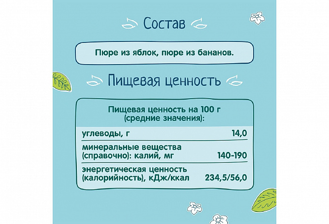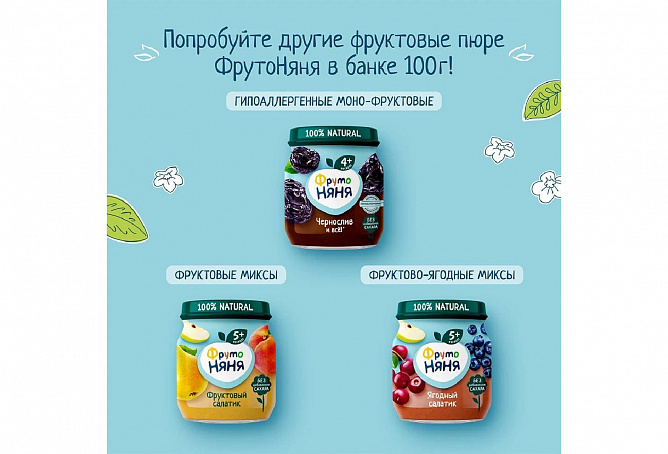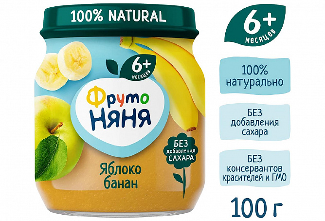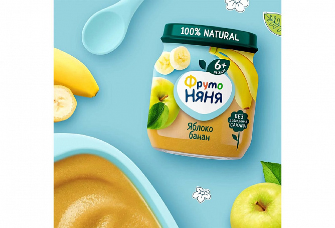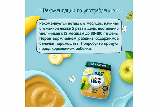 Пюре «ФрутоНяня» из яблок и бананов — это вкусный и сытный продукт, предназначенный для прикорма детей с 6 месяцев. В составе 100% натуральные ингредиенты из отборных фруктов, чтобы ваш малыш рос здоровым и активным. С вкусным и питательным пюре «ФрутоНяня» ребенок быстро зарядится энергией, чтобы познавать мир и открывать для себя что-то новое каждый день.