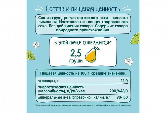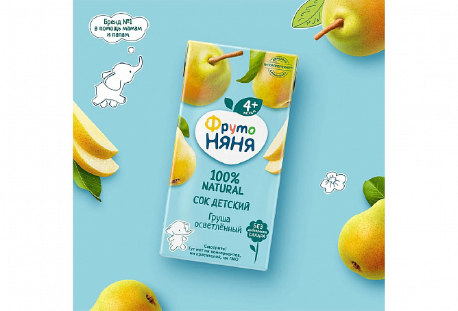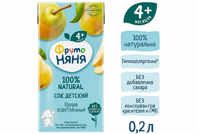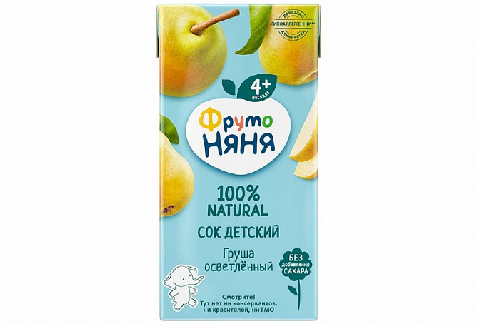 Осветленный грушевый сок «ФрутоНяня» содержит в себе на 100% натуральные компоненты без добавления сахара. Он гипоаллергенный, и это подтверждено клинически. Для его приготовления мы использовали самые спелые и сладкие груши, выращенные в экологически чистых условиях. Ведь здоровье вашего малыша у нас в приоритете. Сок грушевый «ФрутоНяня» можно использовать в качестве первого прикорма, что разнообразит рацион ребенка от 4 месяцев. Упаковка 200 мл подойдет, чтобы взять с собой на прогулку, или чтобы пить из нее дома.