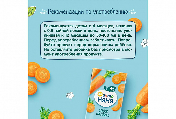 Рекомендуется детям с 4 месяцев, начиная с 0,5 чайной ложки в день, постепенно увеличивая к 12 месяцам до 50-100 мл в день. Попробуйте продукт перед кормлением ребёнка. Не оставляйте ребёнка без присмотра в момент употребления продукта.