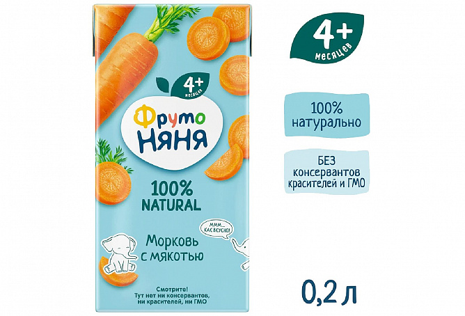 Почему нектар из моркови с мякотью «ФрутоНяня» такой вкусный? Потому что в его составе только 100% натуральные ингредиенты. Всё для того, чтобы ваш малыш зарядился пользой и витаминами свежих овощей, получив массу приятных впечатлений. Морковный нектар «ФрутоНяня» станет отличным дополнением к рациону малышей от 4 месяцев, добавив в него знакомый вкус моркови, но уже в новом формате.