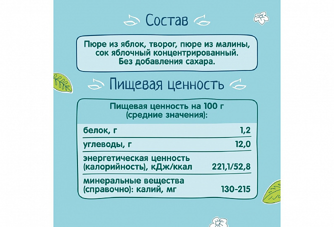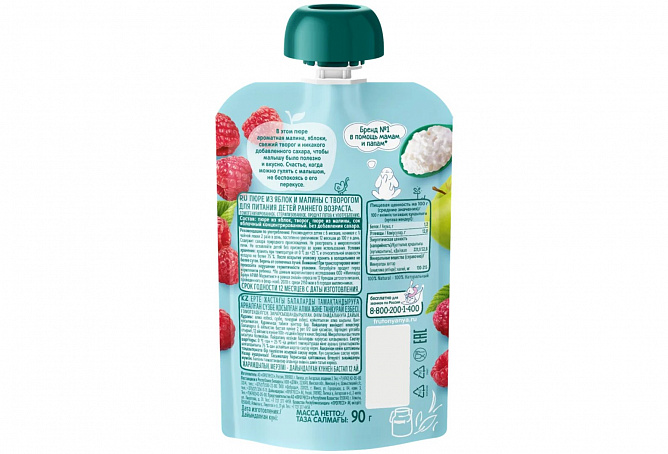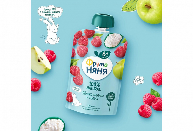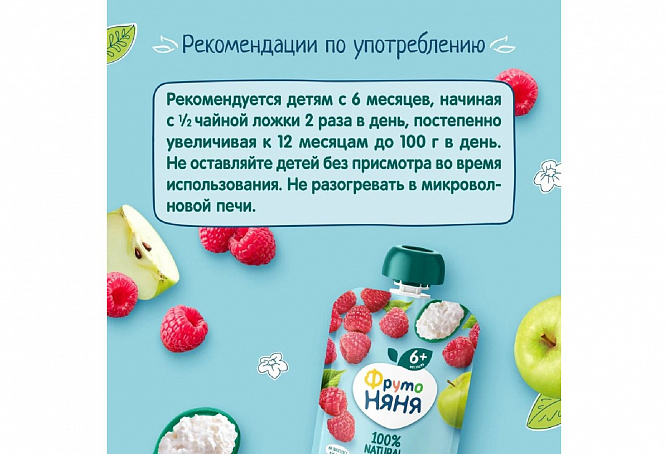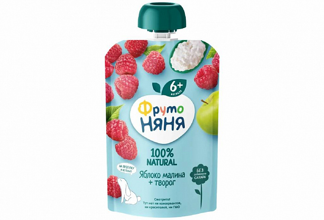 Фруктовое пюре «ФрутоНяня» из яблок и малины с творогом разработано специально для того, чтобы разнообразить рацион вашего малыша. В нём польза натурального творога, необходимого для гармоничного роста и развития малыша, сочетается со вкусом отборных спелых ягод и фруктов.
