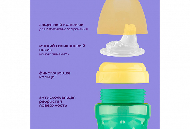Поильник-непроливайка c мягким силиконовым носиком подходит для детей, которые только учатся пить самостоятельно. Принцип питья из поильника с мягким носиком схож с питьем из бутылочки или при грудном вскармливании, поэтому ребенок быстро поймет, как им пользоваться. Поильник легкий и не бьющийся.Прозрачность поильника и мерная шкала позволяют контролировать количество жидкости, которое ребенок выпивает. Колпачок защищает носик от загрязнения, позволяет брать поильник на прогулку, а открыть его можно одной рукой. Изготовлен из безопасных материалов, не содержащих бисфенол-А.