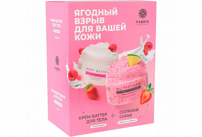 Подарочный набор ФК (Fabrik Cosmetology) "Ягодный взрыв для вашей кожи" общим объемом 630 мл — это комплексное решение для ухода за кожей тела. Набор включает два основных продукта: крем-баттер и соляной скраб. Средства обладают яркими ягодными ароматами (малина, клубника, бергамот) и предназначены для питания, увлажнения, очищения и смягчения кожи. Регулярное использование помогает насытить кожу витаминами и антиоксидантами, удерживать влагу, препятствовать сухости и шелушению.