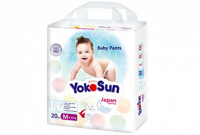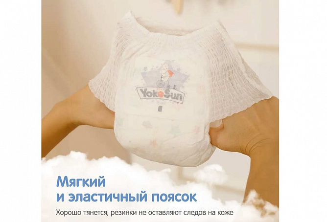 Подгузники-трусики YokoSun изготовлены из мягчайших материалов, очень тонкие и дышащие, впитывают влагу и удерживают ее внутри. Уникальное строение впитывающего слоя делает подгузники тонкими и легкими, за счет нового внутреннего слоя, впитывание происходит еще быстрее. Он выполнен из двухслойной 3D ткани, которая быстро пропускает влагу внутрь и препятствует ее выходу наружу. При намокании гель-абсорбент (японской фирмы Sumitomo) остается на своих местах, что исключает появление пустот внутри подгузника . Эластичный поясок мягко и плотно облегает талию малыша, препятствует подтеканию жидкости вдоль спины.