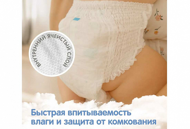 Невидимый абсорбирующий слой. Уникальный состав среднего впитывающего слоя обеспечивает быстрое впитывание жидкости и сухую поверхность подгузника, защищая кожу малыша от покраснений. Продукт сертифицирован по ISO9001.