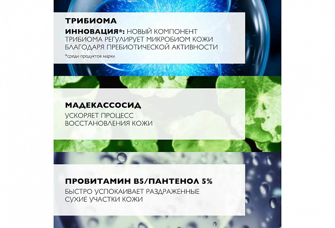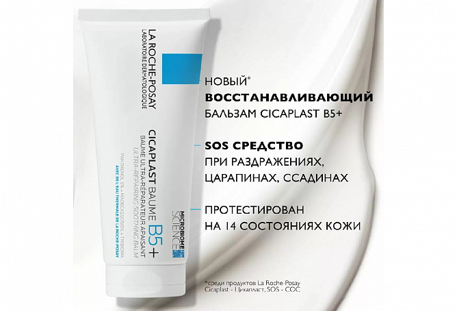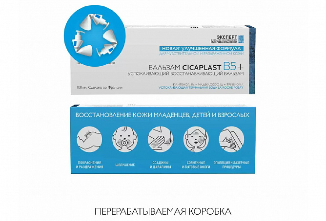 Новая улучшенная формула бальзама Cicaplast B5+ вдохновлена наукой о микробиоме и включает Трибиому – уникальный комплекс пребиотиков из молочной закваски, сахара натурального происхождения, Пантенол 5% и Мадекассосид для моментального успокоения кожи и восстановления ее барьера, а также комплекс с признанными антибактериальными свойствами Цинк+Марганец.