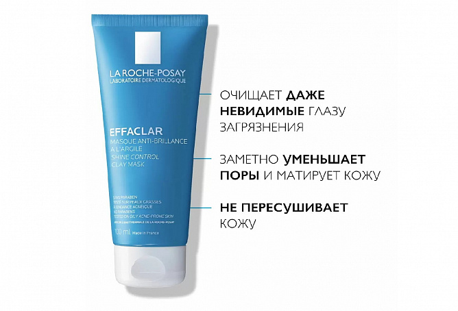 МАСКА ДЛЯ ЛИЦА EFFACLAR ГЛУБОКО ОЧИЩАЕТ ПОРЫ, удаляя даже невидимые глазу загрязнения, и заметно матирует кожу, не вызывая ощущения сухости. Маска Effaclar содержит два вида минеральной глины, которые обеспечивают интенсивный очищающий эффект. Термальная вода La Roche-Posay успокаивает и увлажняет кожу.