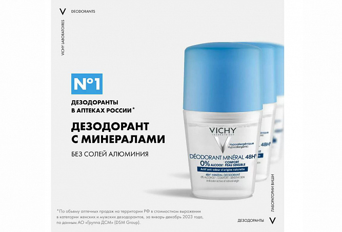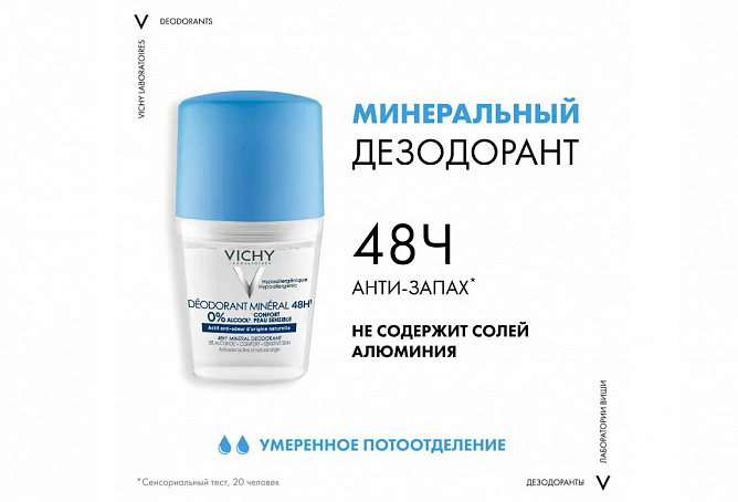 Новый дезодорант VICHY без солей алюминия – настоящий коктейль важных для кожи минералов, подкрепленный вулканической термальной водой VICHY. Дезодорант на водной основе обеспечивает прозрачное нанесение без пятен на одежде. Дарит нейтральный аромат «свежести» и «чистоты», благодаря сочетанию цветочных и пудровых нот. Эффективность средства подтверждена клинически: