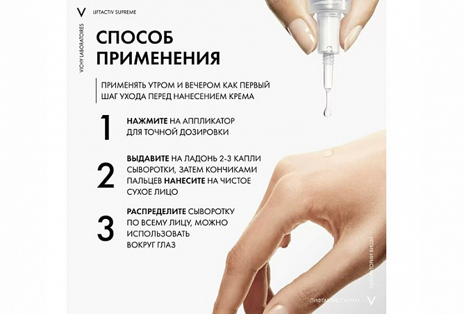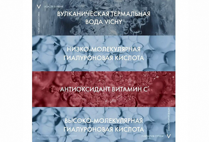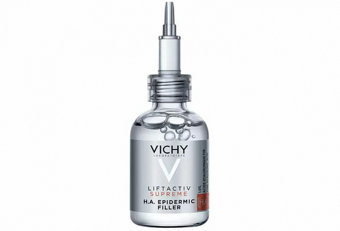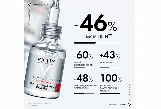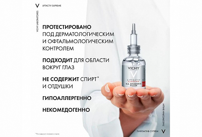 В результате длительных исследований в поиске альтернативы косметологическим процедурам, Эксперты лабораторий Виши разработали Инновацию** - Гиалуроновую сыворотку-филлер пролонгированного действия Liftactiv Supreme с рекордной концентрацией* чистой Гиалуроновой кислоты [1,5%] для ежедневного восполнения Гиалуроновой кислоты в эпидермисе.