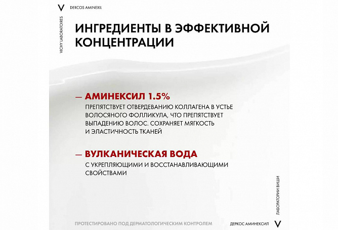 Впервые эксперты Лабораторий VICHY установили, что для решения проблемы выпадения волос нужно воздействовать не только на корень волоса, но и на кожу головы, которая может ослабляться под влиянием негативных внешних и внутренних факторов. AMINEXIL INTENSIVE 5 — первое комплексное средство, которое действует на всех уровнях: на корни волос, кожу головы и волокно волоса, помогая эффективно бороться с выпадением волос.