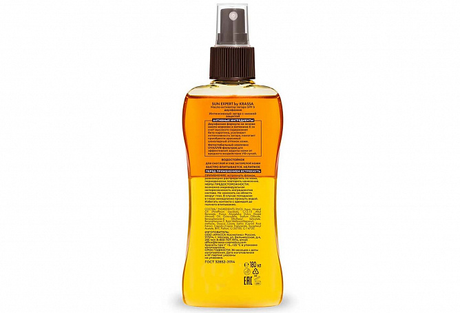 • Роскошное масло для ровного шоколадного загара. Двухфазная формула на основе масла моркови и витамина E за счет высокого содержания бета-каротина, усиливает интенсивность загара, помогает приобрести красивый шоколадный оттенок кожи. В составе фотостабильный комплекс UVA/UVB-фильтров для эффективной защиты кожи от вредного воздействия УФ-лучей.
