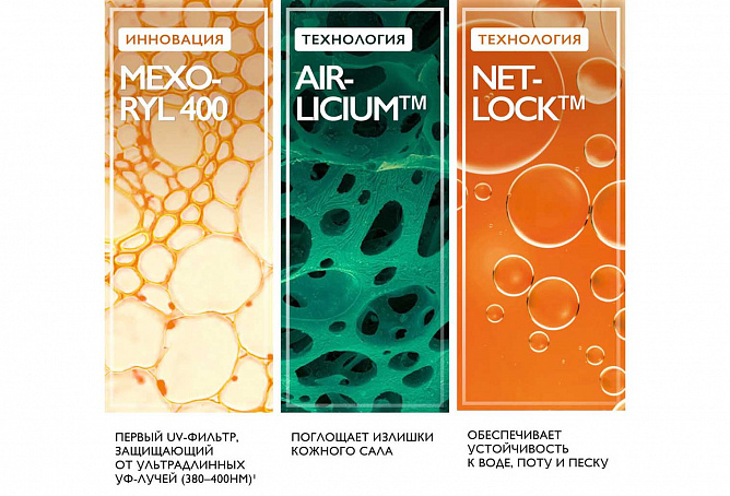 Защита от широкого спектра УФ-лучей: UVB-, UVA- и ультрадлинных UVA-лучей. Инновационный1 UV-фильтр Mexoryl 400 защищает от ультрадлинных UVA-лучей (380-400 нм) которые незаметны, повреждают кожу на глубоком клеточном уровне и составляют 30% УФ-лучей, воздействующих на кожу круглый год.