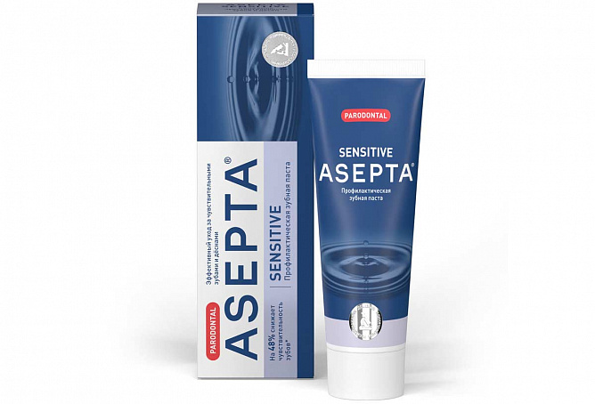 Лечебно-профилактическая зубная паста -Асепта- - средство гигиены полости рта с противовоспалительным эффектом, применяемое при лечении и для профилактики воспалительных заболеваний пародонта.Эффективность применения зубной пасты -Асепта- обусловлена наличием в её составе следующих компонентов:экстракты шалфея, календулы и зверобоя оказывают противомикробное и противовоспалительное действие;фермент папаин расщепляет белковую матрицу назубных отложений, замедляет образование зубной бляшки.
