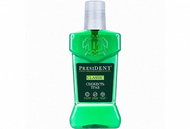 Ополаскиватель для полости рта PRESIDENT Classic освежает полость рта, укрепляет эмаль, служит дополнительной профилактикой кариеса и обладает деликатным антибактериальным действием. Является эффективным дополнением к зубной пасте President Classic. При разбавлении 1:5 может быть использован как жидкость для ирригатора. Проникает в самые труднодоступные участки. Ромашка и Шалфей уменьшают воспаление. Ксилитол подавляет рост бактерий. Фтор укрепляет эмаль. Не содержит спирт, SLS.