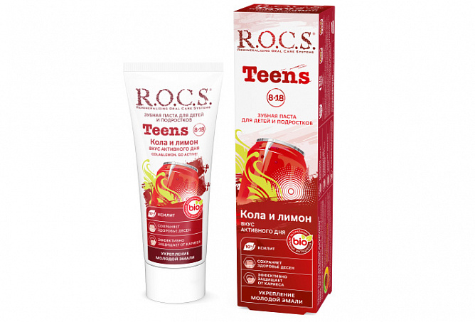 • ЗУБНАЯ ПАСТА ДЛЯ ДЕТЕЙ И ПОДРОСТКОВ R.O.C.S.® TEENS. GO ACTIVE. COLA & LEMON (TEENS. ВКУС АКТИВНОГО ДНЯ. КОЛА И ЛИМОН)