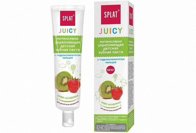 Пасты для детей всех возрастов SPLAT® Juicy® глубоко восстанавливают и укрепляют твердые ткани зубов, эффективно защищают от кариеса и налета. Cистема LUCTATOL® ингибирует до 96% мягкого зубного налета и уничтожает кариесогенные бактерии. Зубная паста абсолютно безопасна при проглатывании.