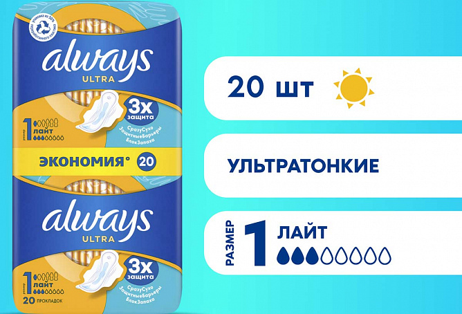 - Технология «Блок запаха» нейтрализует неприятные запахи, придавая ощущение свежести и чистоты во время менструации. С Always Ultra вы можете чувствовать себя уверенно весь день.