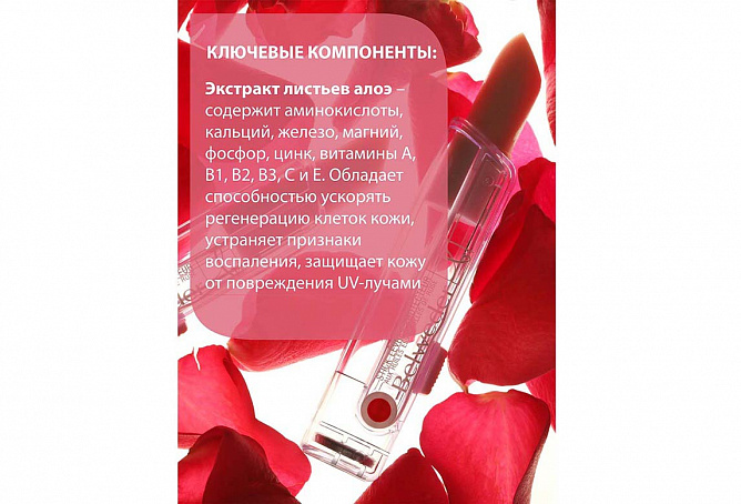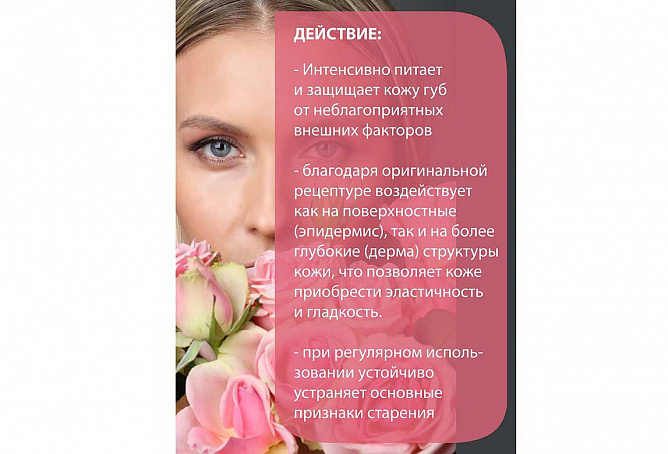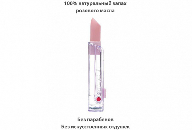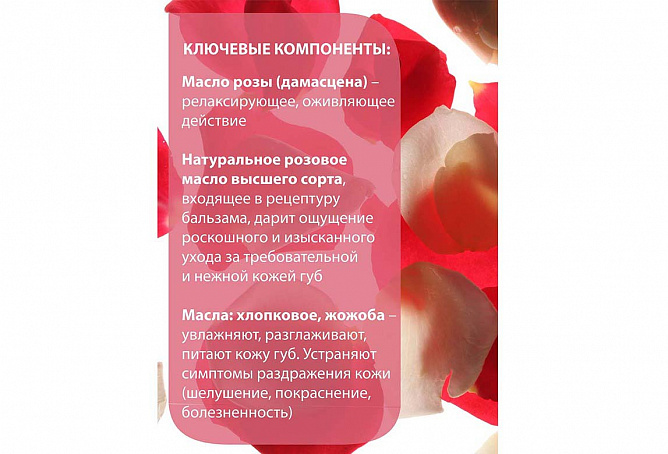 Натуральное розовое масло высшего сорта, входящее в рецептуру бальзама, дарит ощущение роскошного и изысканного ухода за требовательной и нежной кожей губ.