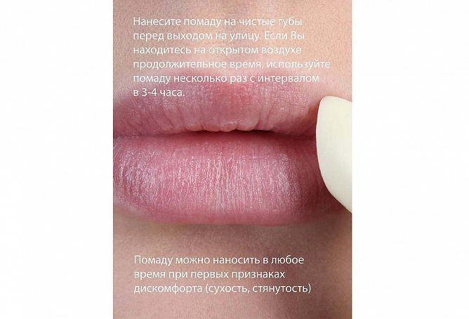 Нанесите помаду на чистые губы перед выходом на улицу. Если Вы находитесь на открытом воздухе продолжительное время, используйте помаду несколько раз с интервалом в 3-4 часа. Помаду можно наносить в любое время при первых признаках дискомфорта (сухость, стянутость).