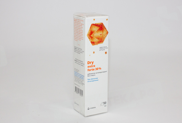 DRY CONTROL EXTRA FORTE содержит 30% активного вещества и предназначен для тяжелой степени гипергидроза.