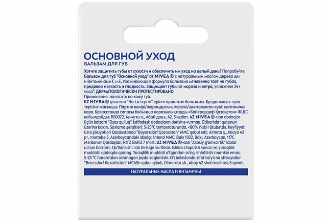 Хотите защитить ваши губы от сухости и обеспечить им уход, который длится целый день? Попробуйте бальзам для губ Основной уход от NIVEA со специальной усовершенствованной формулой с натуральным маслом дерева ши и Витаминами С и Е. Ухаживающая формула бальзама мгновенно тает на губах, придавая мягкость и гладкость, защищает от мороза и ветра, увлажняя 24+ часа. Гигиеническая помада подходит для использования в любое время года, особенно в сухой летний период или холодный зимний. Натуральные масла и витамины в составе. Дерматологически протестировано. На 100% безопасное для климата производство.