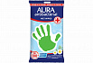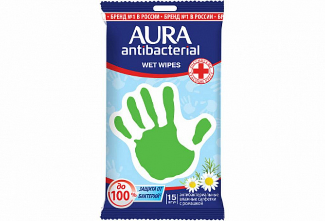 AURA Влажные салфетки антибактериальные имеют поддержку Российского Красного Креста. Яркая упаковка с разноцветными ладошками имеет отверстие для подвешивания.