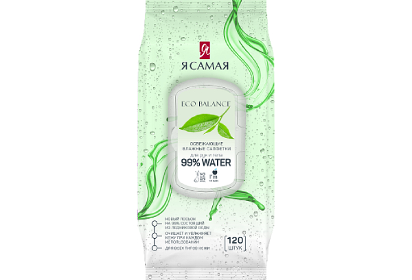 -Освежающий лосьон салфеток Я САМАЯ на 99% состоит из воды высокой степени очистки. Эта вода не содержит примесей тяжелых солей металлов и микроорганизмов.