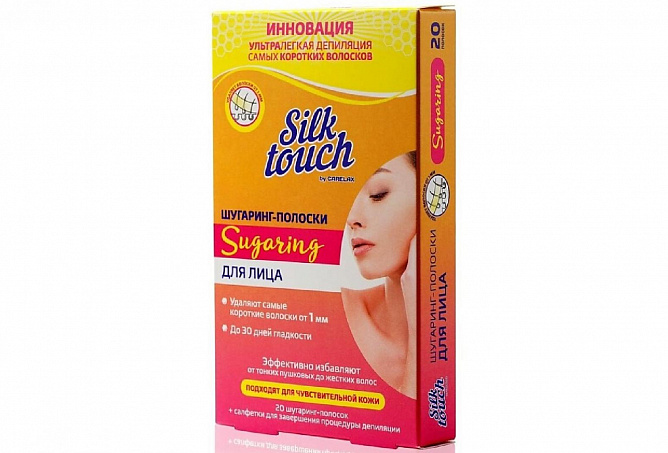 Инновационные шугаринг-полоски Carelax Silk Touch для лица. Удаляют даже самые короткие волоски от 1 мм, кожа гладкая до 30 дней. Эффективно избавляют от тонких пушковых до жестких волос, подходят для чувствительной кожи. При регулярном применении замедляется рост нежелательных волосков. Они становятся тоньше и менее заметными. В комплект входит 20 (10 склееных по 2) полосок и 2 салфетки с экстрактом ромашки для бережного ухода и завершения процедуры.