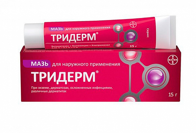 Мазь Тридерм сочетает в себе противовоспалительный, противозудный, противоаллергический и антиэкссудативный эффект глюкокортикостероида (ГКС) бетаметазона дипропионата с противогрибковой активностью клотримазола и широким антибактериальным действием гентамицина сульфата.