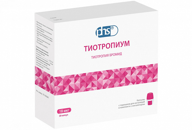 Тиотропиум - м-холиноблокатор продолжительного действия. Обладает одинаковым сродством к различным подтипам мускариновых рецепторов от М1 до M5. Результатом ингибирования М3-рецепторов в дыхательных путях является расслабление гладкой мускулатуры. Бронходилатирующий (бронхорасширяющий) эффект сохраняется в течение не менее 24 часов и зависит от дозы тиотропия бромида. Значительная продолжительность действия связана, вероятно, с очень медленной диссоциацией тиотропия бромида от М3-рецепторов по сравнению с ипратропия бромидом.