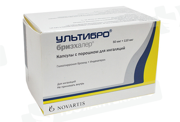 Фармакодинамика Эффект препарата Ультибро Бризхалер наступает уже через 5 минут после ингаляции и остается неизменным на протяжении 24-х часов, обеспечивая стойкое значимое улучшение функции легких: на 26 неделе терапии повышение объема форсированного выдоха за первую секунду (ОФВ1) в среднем на 320 мл по сравнению с пациентами, получавшими плацебо, и на 110 мл по сравнению с монотерпией гликопирронием, индакатеролом или тиотропием.