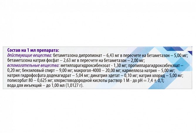 Вспомогательные вещества: метилпарагидроксибензоат - 1.3 мг, пропилпарагидроксибензоат - 0.2 мг, бензиловый спирт - 9 мг, макрогол 4000 - 20 мг, кармеллоза натрия - 5 мг, натрия гидрофосфата додекагидрат - 5.04 мг, динатрия эдетат - 0.1 мг, натрия хлорид - 5 мг, полисорбат 80 - 0.625 мг, вода д/и - до 1 мл.
