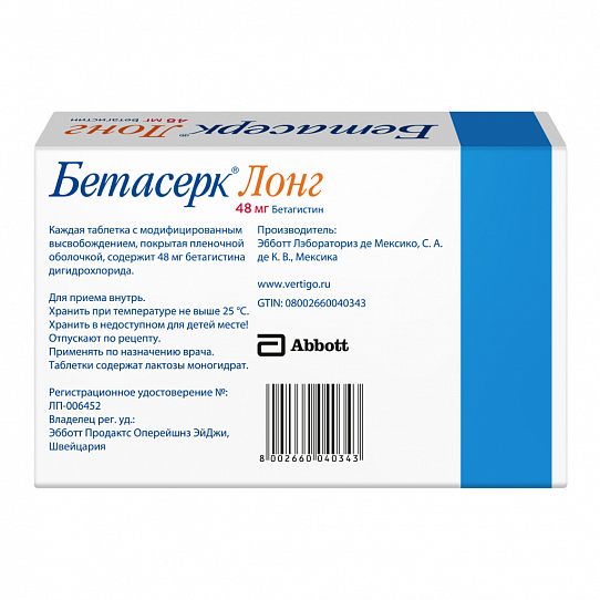 Бетасерк Лонг 48 мг таблетки с модиф высвобожд покрытые пленочной оболочкой N60
