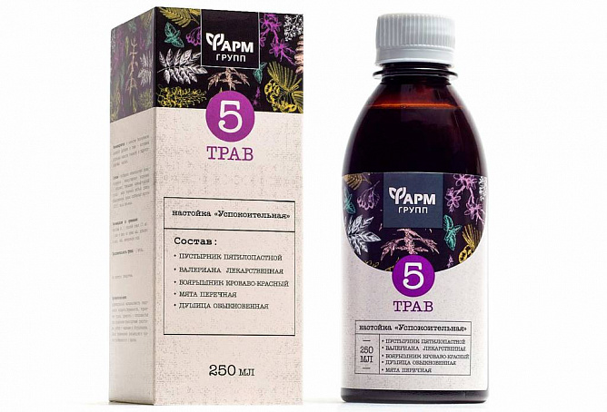 НАСТОЙКА 5 ТРАВ УСПОКОИТЕЛЬНАЯ – Биологически активная добавка (БАД) к пище - проверенный временем рецепт, содержит экстракты пустырника, валерианы, боярышника, мяты, душицы. Применяется как успокоительное средство, при проблемах со сном, нервных расстройствах, повышенном давлении. Настойка полезна для укрепления сердца и нормализации давления.