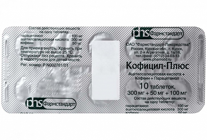 1 таблетка содержит: ацетилсалициловая кислота – 300,0 мг, парацетамол – 100,0 мг, кофеин (кофеин безводный) – 50,0 мг.