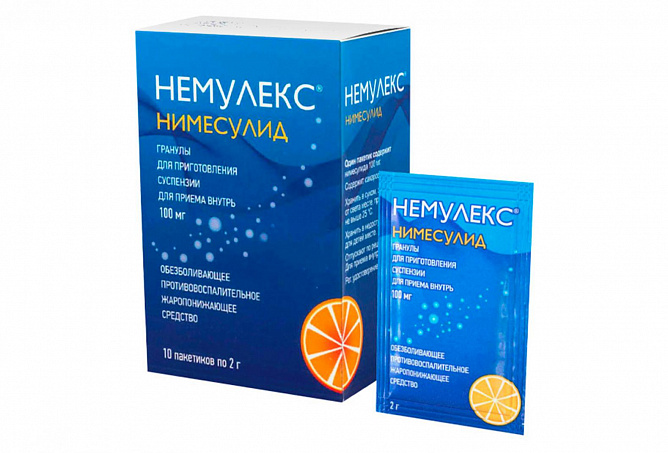 1 пакетик препарата содержит: активное вещество: нимесулид 100 мг; вспомогательные вещества: макрогола цетостеарат (кремофор А25) - 100 мг, лимонная кислота безводная - 19 мг, кремния диоксид коллоидный (аэросил) -40 мг, сахароза - 1721 мг, ароматизатор апельсиновый - 20мг.