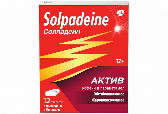 Солпадеин Актив таблетки, покрытые пленочной оболочкой, №12 — обезболивающее средство для облегчения болевого синдрома слабой и умеренной интенсивности, в том числе таких видов боли, как головная, зубная, мигрень и другие. Подходит для взрослых и детей с 12 лет. Производится в Ирландии.
