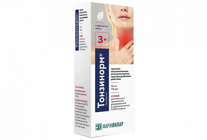 бензидамин - в удобной форме спрея по доступной цене известного российского производителя ФармВИЛАР. Обеспечивает 4 действия сразу: антибактериальное, противогрибковое, снимает воспаление,
