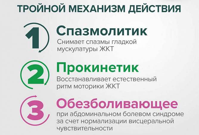 Нормализуя висцеральную чувствительность, тримебутин обеспечивает анальгетический эффект при абдоминальном болевом синдроме.